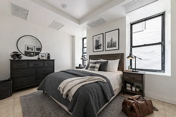 The apartment features a modern, windowed kitchen equipped with a dishwasher, ample cabinetry, and abundant counter space — perfect for everyday cooking or entertaining friends and family. Each bedroom is oversized, offering flexibility for sleeping, home offices, or creative spaces, all enhanced by large windows that flood the home with warm natural light.