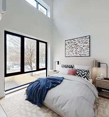 Spread across two spacious levels, this unique home features refined hardwood floors, soaring ceilings, and an airy, open layout that maximizes light and space. The upper level offers a sunlit living and dining area, anchored by a sleek, contemporary kitchen complete with stainless steel appliances, dishwasher, and custom cabinetry—perfect for both quiet nights in and casual entertaining.